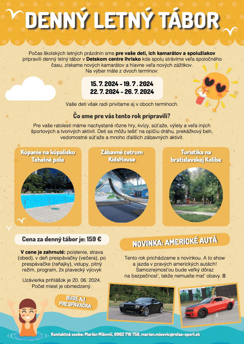 Prosíme rodičov, ktorí majú záujem o zápis svojho dieťaťa do denného tábora, aby zaslali prihlášku v čo najkratšom čase, nakoľko máme len obmedzený počet miest.
